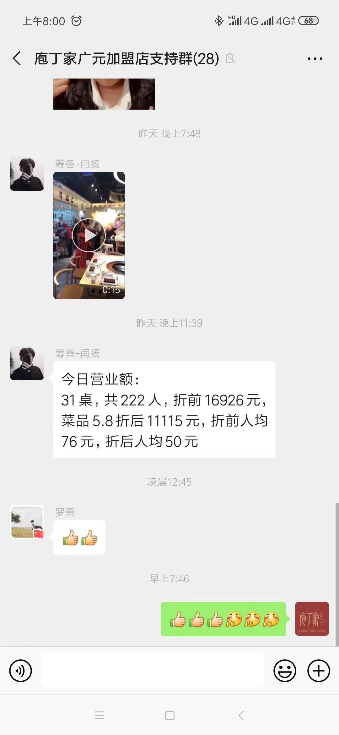 昨日,庖丁家四川廣元店接待31桌,共222人,折前16926元,菜品5.8折后11115元,折前人均76元,折后人均50元。