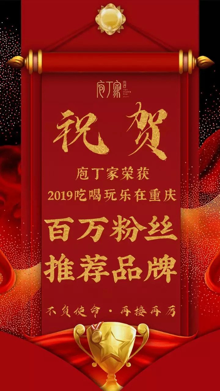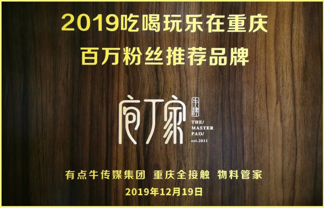 恭賀庖丁家獲2019吃喝玩樂在重慶百萬粉絲推薦品牌
