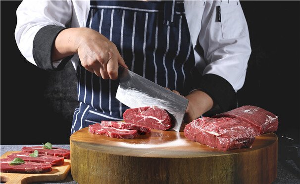 甄選散養兩年的小黃牛作為食材,以庖丁解牛古法技藝為解牛之道,精細分解,推出精致鮮切水煮牛排,經湯熬煮三分鐘(漏斗計時),肉質飽滿、彈性十足,大塊水煮牛排蘸上秘制醬料,入口鮮嫩,更有嚼勁。