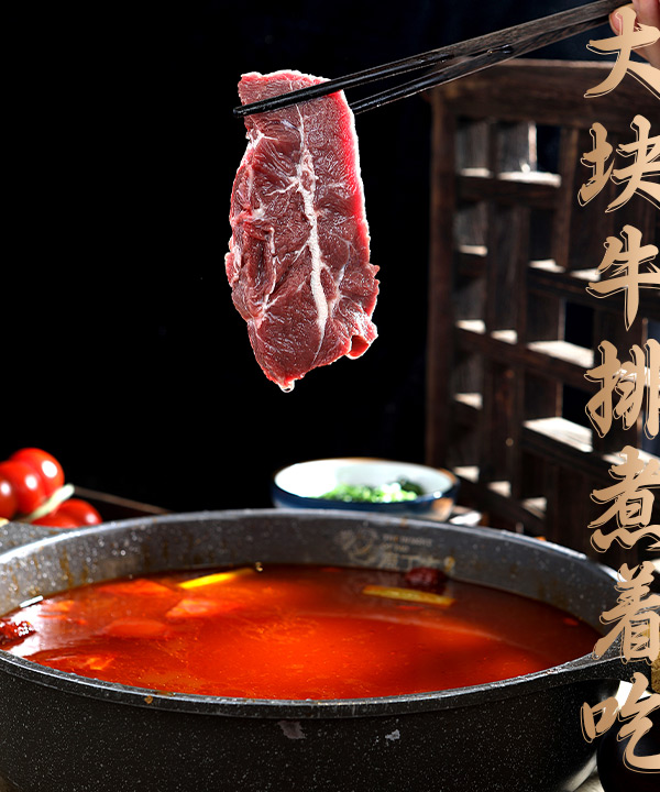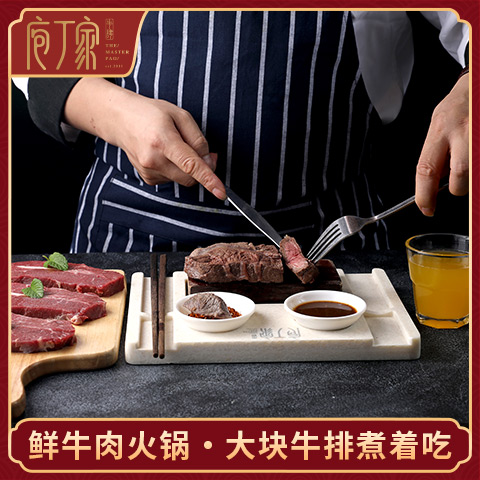 庖丁家牛肆仿古人,庖丁解牛之技匠人精神。開創獨有的3肆匠人準則,遵照3M烹煮標準用極簡的水煮之藝,將新鮮食物煮至好。其招牌菜“水煮牛排”火鍋 甫一面世,就成為餐飲市場的“網紅產品”,創造牛肉新吃法。水煮牛排甄選出散養兩年的小黃牛作為食材,精選有筋牛排,牛排經湯熬煮三分鐘,肉質飽滿、彈性十足,大塊水煮牛排沾上秘制醬料,入口鮮活而有勁道。