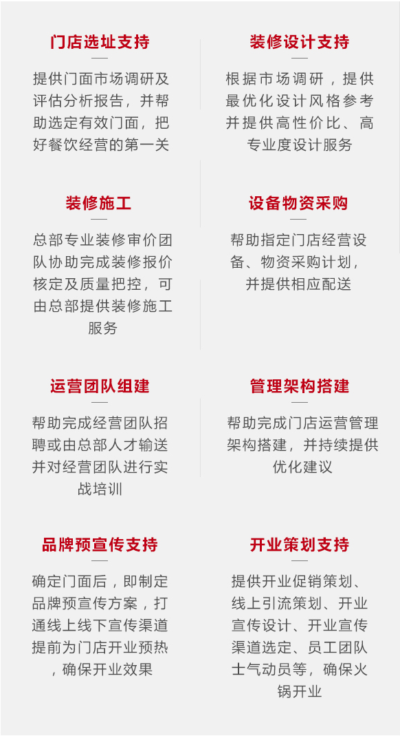 提供開業促銷策劃、線上引流策劃、開業宣傳設計、開業宣傳渠道選定、員工團隊士氣動員等,確保火鍋開業